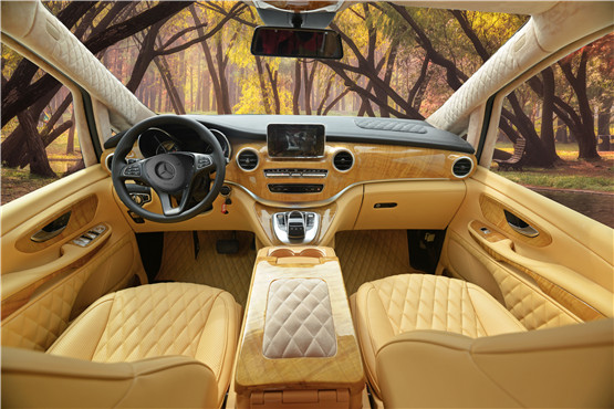 新款奔驰威霆改装商务车7座商务车,改装商务车版在座椅方面也同样做了质的提高,航空头等舱座椅,坐上去软硬适中,乘客舱中的秘书座椅能够全主动调理,“首长席”电动操控,带多项按摩功用,柚木装修下,现代感更为激烈,条纹外表更具侵略性。乘客舱中装备一键式超静音32寸高清液晶升降电视,隐藏式办公桌板、指纹识别快捷保险柜、无线网络终端接口、BSB、VGA多功用连接口。不管商务、旅行、文艺、清新、精约……什么风格都能Hold得住。